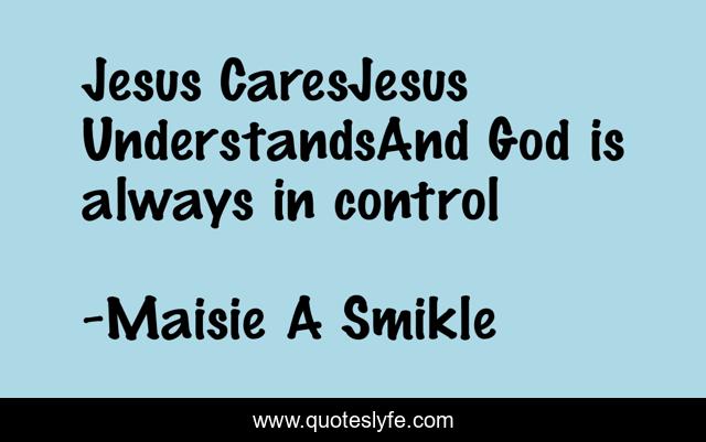 This page presents the quote "Jesus CaresJesus UnderstandsAnd God is always in control". Author of this quote is Maisie A Smikle. This quote is about enthusiasm, inspirational,.