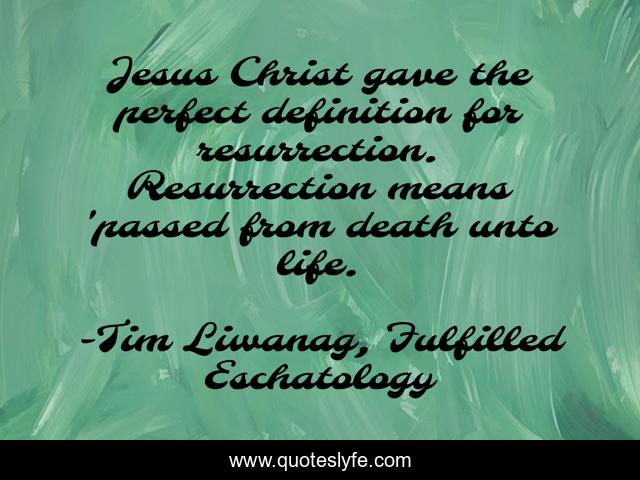 This page presents the quote "Jesus Christ gave the perfect definition for resurrection. Resurrection means 'passed from death unto life.". Author of this quote is Tim Liwanag, Fulfilled Eschatology. This quote is about jesus-christ, resurrection,.