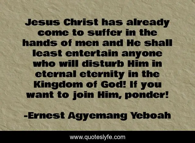 This page presents the quote "Jesus Christ has already come to suffer in the hands of men and He shall least entertain anyone who will disturb Him in eternal eternity in the Kingdom of God! If you want to join Him, ponder!". Author of this quote is Ernest Agyemang Yeboah. This quote is about confidence, heaven, christian, living-well, motivational, righteous-living, christianity, heaven-and-hell, the-coming-of-jesus-christ,.