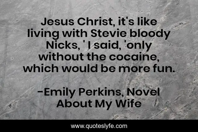 This page presents the quote "Jesus Christ, it's like living with Stevie bloody Nicks, ' I said, 'only without the cocaine, which would be more fun.". Author of this quote is Emily Perkins, Novel About My Wife. This quote is about drugs, spirituality, hippies, new-age,.