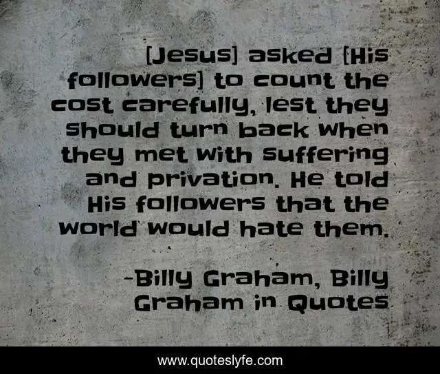 This page presents the quote "[Jesus] asked [His followers] to count the cost carefully, lest they should turn back when they met with suffering and privation. He told His followers that the world would hate them.". Author of this quote is Billy Graham, Billy Graham in Quotes. This quote is about followers, billy-graham,.