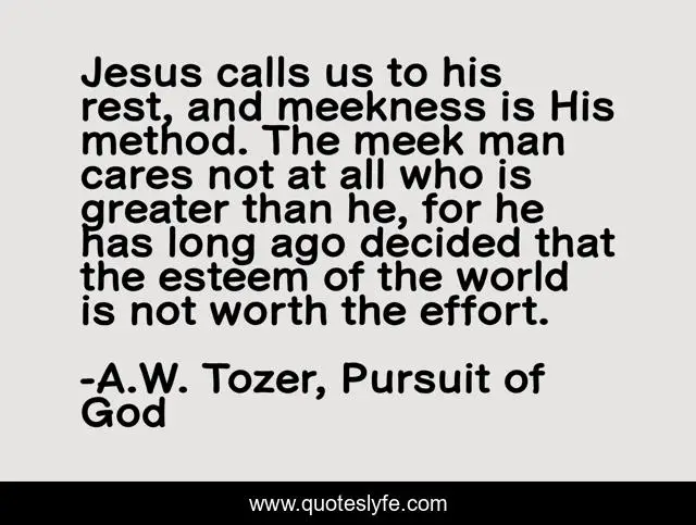 This page presents the quote "Jesus calls us to his rest, and meekness is His method. The meek man cares not at all who is greater than he, for he has long ago decided that the esteem of the world is not worth the effort.". Author of this quote is A.W. Tozer, Pursuit of God. This quote is about spiritual-growth, discipleship, christianity,.