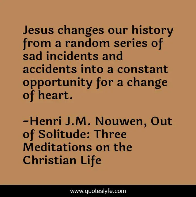 This page presents the quote "Jesus changes our history from a random series of sad incidents and accidents into a constant opportunity for a change of heart.". Author of this quote is Henri J.M. Nouwen, Out of Solitude: Three Meditations on the Christian Life. This quote is about change, jesus,.