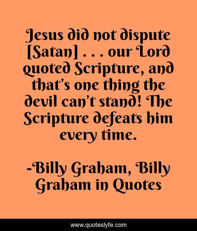 This page presents the quote "Jesus did not dispute [Satan] . . . our Lord quoted Scripture, and that’s one thing the devil can’t stand! The Scripture defeats him every time.". Author of this quote is Billy Graham, Billy Graham in Quotes. This quote is about devil, satan, billy-graham,.