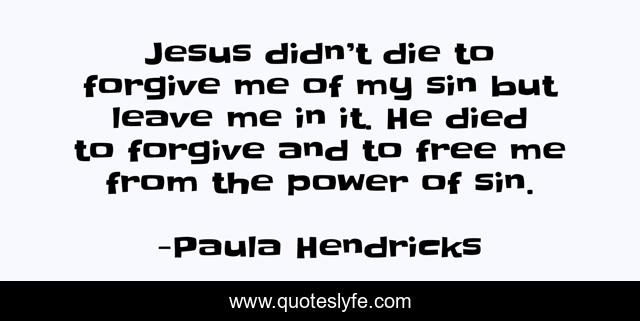 This page presents the quote "Jesus didn’t die to forgive me of my sin but leave me in it. He died to forgive and to free me from the power of sin.". Author of this quote is Paula Hendricks. This quote is about free, power, sin,.