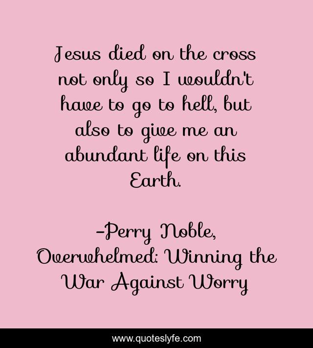 This page presents the quote "Jesus died on the cross not only so I wouldn't have to go to hell, but also to give me an abundant life on this Earth.". Author of this quote is Perry Noble, Overwhelmed: Winning the War Against Worry. This quote is about eternity, life, heaven, jesus, hell, gospel, worry,.
