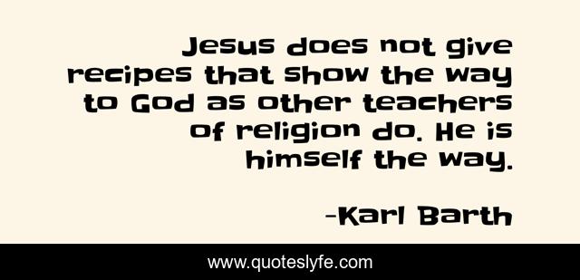 This page presents the quote "Jesus does not give recipes that show the way to God as other teachers of religion do. He is himself the way.". Author of this quote is Karl Barth. This quote is about god, teachers, way,.