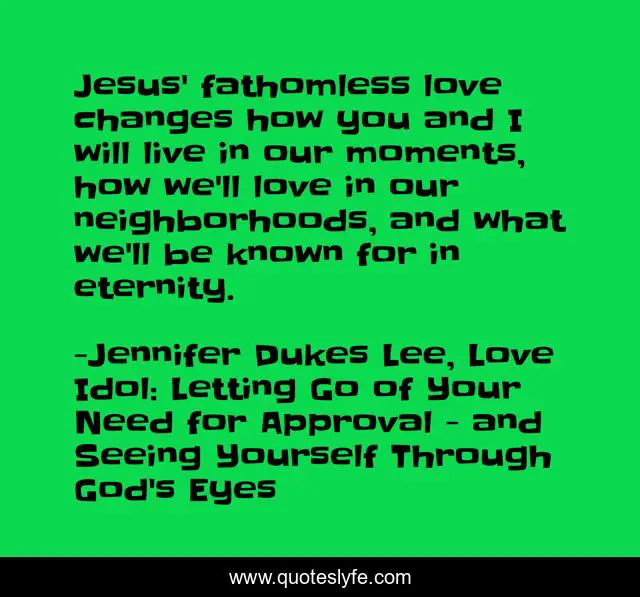 "Jennifer Dukes Lee, Love Idol: Letting Go of Your Need for Approval - and Seeing Yourself Through God's Eyes Quotes." Quoteslyfe.com, 2025. Fri. 05 Dec. 2025. <https://www.quoteslyfe.com/quote/Jesus-fathomless-love-changes-how-you-and-201642>.