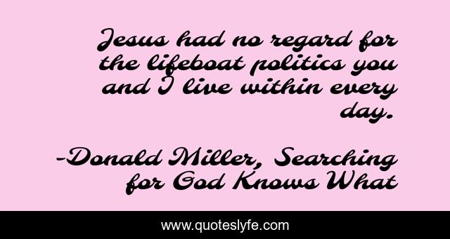 This page presents the quote "Jesus had no regard for the lifeboat politics you and I live within every day.". Author of this quote is Donald Miller, Searching for God Knows What. This quote is about selfishness, fear, discipleship, anxiety, scarcity,.