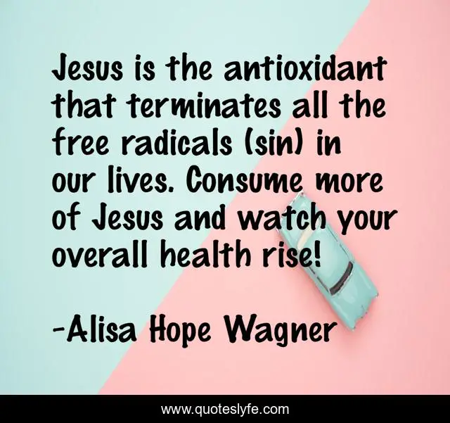 This page presents the quote "Jesus is the antioxidant that terminates all the free radicals (sin) in our lives. Consume more of Jesus and watch your overall health rise!". Author of this quote is Alisa Hope Wagner. This quote is about antioxidants, health, sin, jesus,.