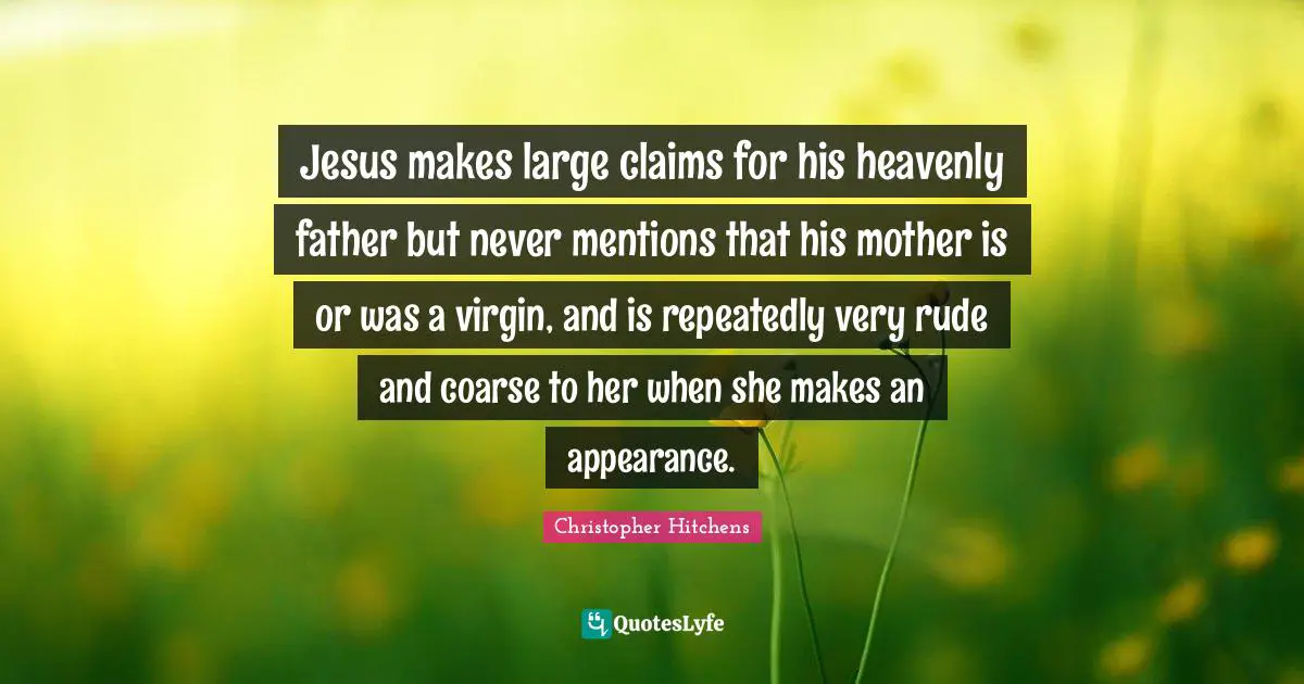This page presents the quote "Jesus makes large claims for his heavenly father but never mentions that his mother is or was a virgin, and is repeatedly very rude and coarse to her when she makes an appearance.". Author of this quote is Christopher Hitchens. This quote is about claims, mother, jesus, heavenly father, coarse, appearance, rude, father,.