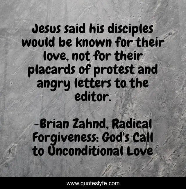 This page presents the quote "Jesus said his disciples would be known for their love, not for their placards of protest and angry letters to the editor.". Author of this quote is Brian Zahnd, Radical Forgiveness: God's Call to Unconditional Love. This quote is about christianity, love, christ, jesus, discipleship, affection,.