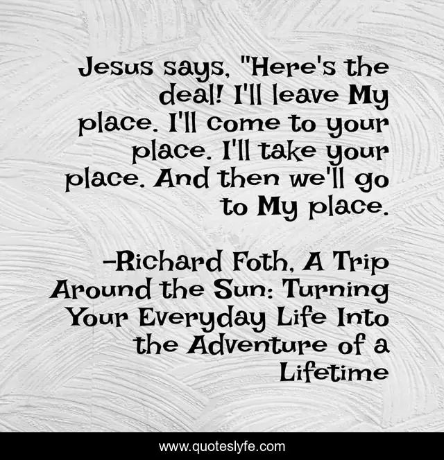 This page presents the quote "Jesus says, "Here's the deal! I'll leave My place. I'll come to your place. I'll take your place. And then we'll go to My place.". Author of this quote is Richard Foth, A Trip Around the Sun: Turning Your Everyday Life Into the Adventure of a Lifetime. .