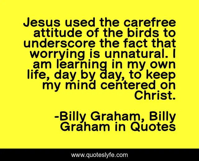 This page presents the quote "Jesus used the carefree attitude of the birds to underscore the fact that worrying is unnatural. I am learning in my own life, day by day, to keep my mind centered on Christ.". Author of this quote is Billy Graham, Billy Graham in Quotes. This quote is about worry, billy-graham,.