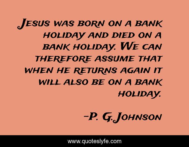 This page presents the quote "Jesus was born on a bank holiday and died on a bank holiday. We can therefore assume that when he returns again it will also be on a bank holiday.". Author of this quote is P. G. Johnson. .