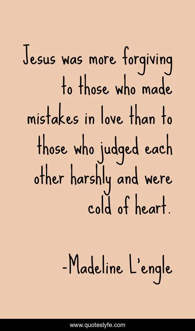 This page presents the quote "Jesus was more forgiving to those who made mistakes in love than to those who judged each other harshly and were cold of heart.". Author of this quote is Madeline L'engle. This quote is about quotes, quotes-about-live, quotes-on-life, quotes-on-life-and-purpose, quotes-to-live-by,.