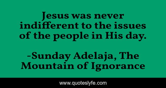 This page presents the quote "Jesus was never indifferent to the issues of the people in His day.". Author of this quote is Sunday Adelaja, The Mountain of Ignorance. This quote is about mountain, life, light, darkness, power, danger, god, people, ignorance,.