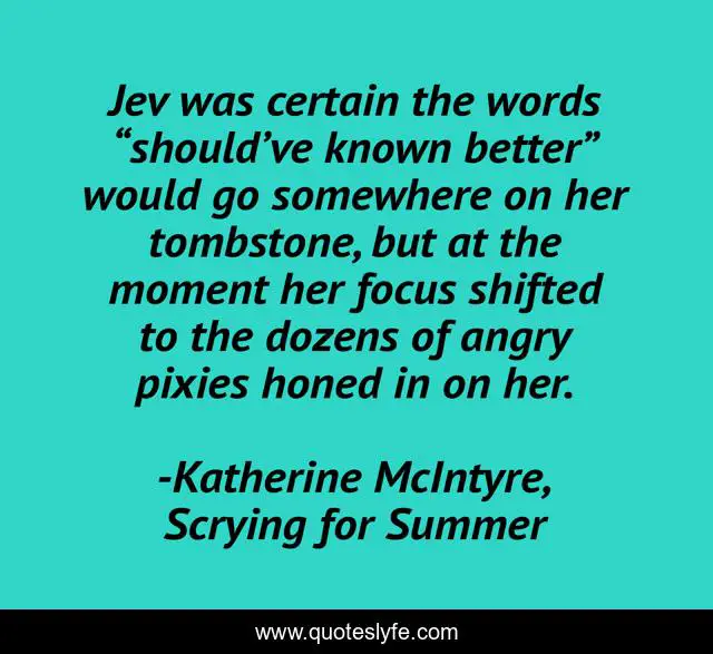 This page presents the quote "Jev was certain the words “should’ve known better” would go somewhere on her tombstone, but at the moment her focus shifted to the dozens of angry pixies honed in on her.". Author of this quote is Katherine McIntyre, Scrying for Summer. This quote is about sass, angry, urban-fantasy, paranormal, fight, tombstone, battle, pixies, fae,.