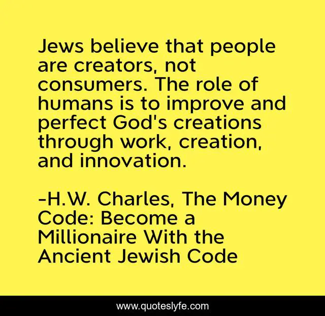 This page presents the quote "Jews believe that people are creators, not consumers. The role of humans is to improve and perfect God's creations through work, creation, and innovation.". Author of this quote is H.W. Charles, The Money Code: Become a Millionaire With the Ancient Jewish Code. This quote is about money-management, wealth, wealth-creation, money, wealth-accumulation, quotes, wealth-plan, wealth-building, jewish-wealth,.
