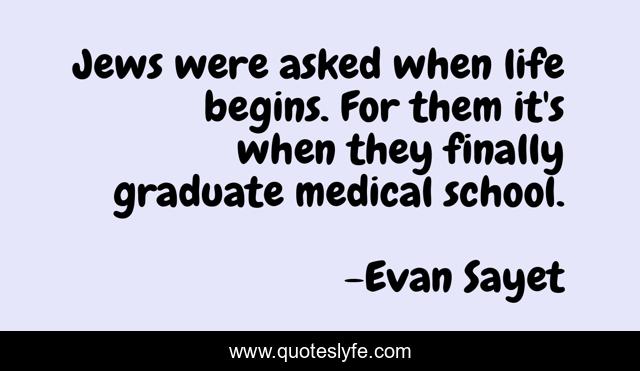 This page presents the quote "Jews were asked when life begins. For them it's when they finally graduate medical school.". Author of this quote is Evan Sayet. This quote is about life, school, medical school,.