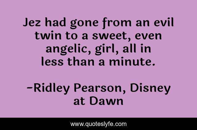 This page presents the quote "Jez had gone from an evil twin to a sweet, even angelic, girl, all in less than a minute.". Author of this quote is Ridley Pearson, Disney at Dawn. This quote is about jez, girl, angelic, twin, evil,.