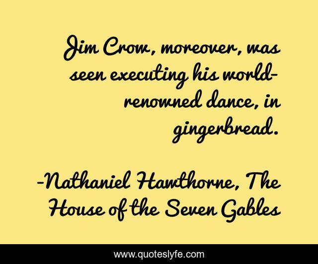 This page presents the quote "Jim Crow, moreover, was seen executing his world-renowned dance, in gingerbread.". Author of this quote is Nathaniel Hawthorne, The House of the Seven Gables. This quote is about dance, gingerbread, jim-crow,.