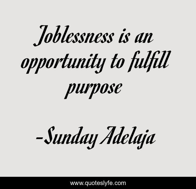 This page presents the quote "Joblessness is an opportunity to fulfill purpose". Author of this quote is Sunday Adelaja. This quote is about life, blessing, finance, money, work, job, jobless, joblessness, purpose,.