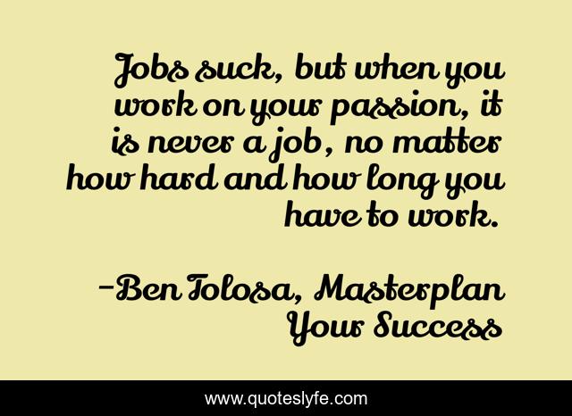This page presents the quote "Jobs suck, but when you work on your passion, it is never a job, no matter how hard and how long you have to work.". Author of this quote is Ben Tolosa, Masterplan Your Success. This quote is about jobs, job-seeking, passion,.