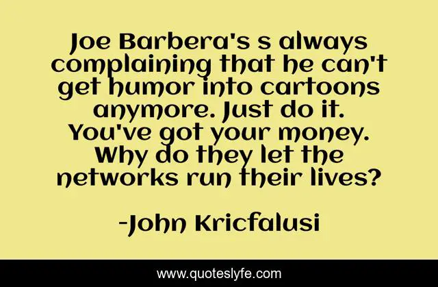 This page presents the quote "Joe Barbera's s always complaining that he can't get humor into cartoons anymore. Just do it. You've got your money. Why do they let the networks run their lives?". Author of this quote is John Kricfalusi. This quote is about money, why,.