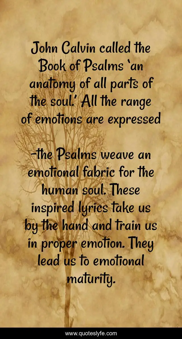 This page presents the quote "John Calvin called the Book of Psalms ‘an anatomy of all parts of the soul.’ All the range of emotions are expressed". Author of this quote is the Psalms weave an emotional fabric for the human soul. These inspired lyrics take us by the hand and train us in proper emotion. They lead us to emotional maturity.. This quote is about the tattooed jesus: what would the real jesus do with pop culture?, kevin swanson,.