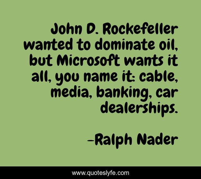 This page presents the quote "John D. Rockefeller wanted to dominate oil, but Microsoft wants it all, you name it: cable, media, banking, car dealerships.". Author of this quote is Ralph Nader. This quote is about media, name,.