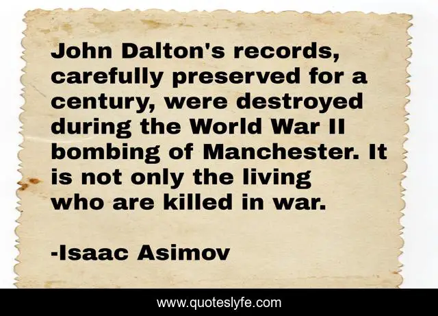 This page presents the quote "John Dalton's records, carefully preserved for a century, were destroyed during the World War II bombing of Manchester. It is not only the living who are killed in war.". Author of this quote is Isaac Asimov. This quote is about loss, world-war, john-dalton, science, wwii, dalton, destruction, war, bombing,.
