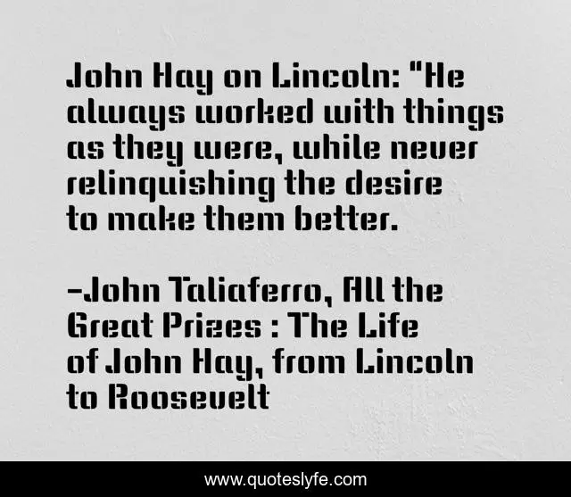 This page presents the quote "John Hay on Lincoln: "He always worked with things as they were, while never relinquishing the desire to make them better.". Author of this quote is John Taliaferro, All the Great Prizes : The Life of John Hay, from Lincoln to Roosevelt. This quote is about goal-setting, pragmatism, optimism, leadership,.
