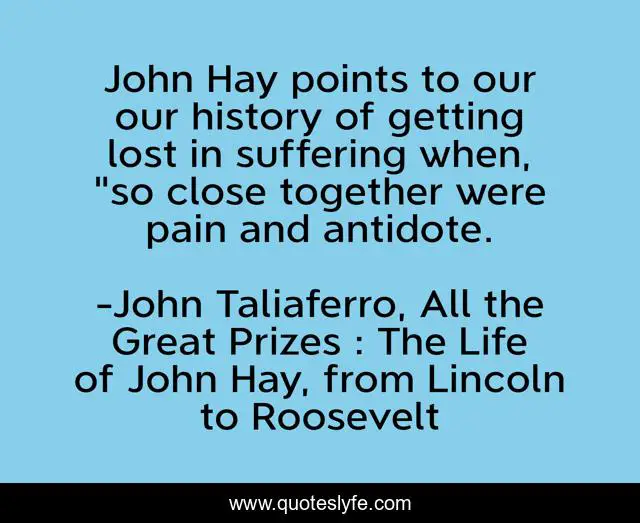 This page presents the quote "John Hay points to our our history of getting lost in suffering when, "so close together were pain and antidote.". Author of this quote is John Taliaferro, All the Great Prizes : The Life of John Hay, from Lincoln to Roosevelt. This quote is about thought-life, despair, pessimism, depression,.