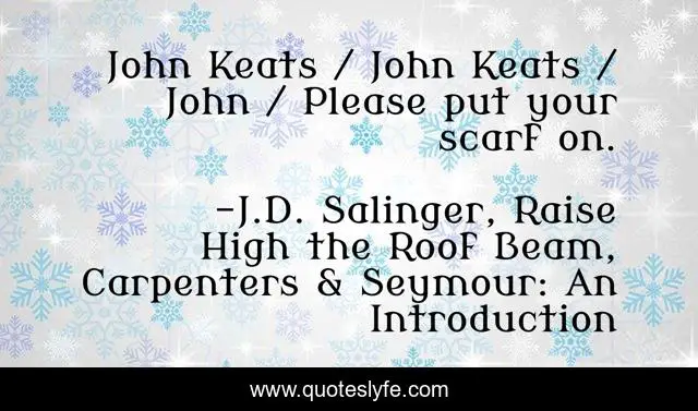 This page presents the quote "John Keats / John Keats / John / Please put your scarf on.". Author of this quote is J.D. Salinger, Raise High the Roof Beam, Carpenters & Seymour: An Introduction. This quote is about glass, see, poetry, more,.