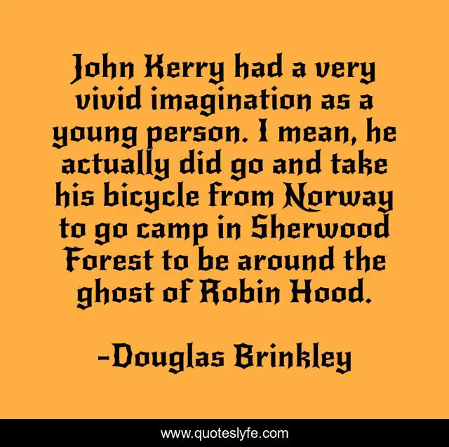 This page presents the quote "John Kerry had a very vivid imagination as a young person. I mean, he actually did go and take his bicycle from Norway to go camp in Sherwood Forest to be around the ghost of Robin Hood.". Author of this quote is Douglas Brinkley. This quote is about bicycle, forest, young,.