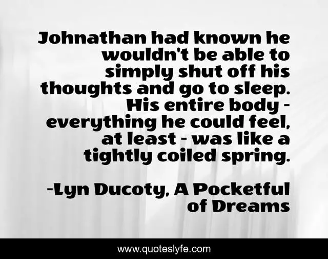 This page presents the quote "Johnathan had known he wouldn't be able to simply shut off his thoughts and go to sleep. His entire body - everything he could feel, at least - was like a tightly coiled spring.". Author of this quote is Lyn Ducoty, A Pocketful of Dreams. This quote is about desire, restraint, tension,.
