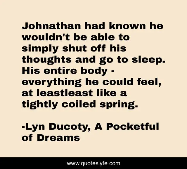 This page presents the quote "Johnathan had known he wouldn't be able to simply shut off his thoughts and go to sleep. His entire body - everything he could feel, at leastleast like a tightly coiled spring.". Author of this quote is Lyn Ducoty, A Pocketful of Dreams. This quote is about desire, restraint, tension,.