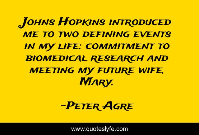 This page presents the quote "Johns Hopkins introduced me to two defining events in my life: commitment to biomedical research and meeting my future wife, Mary.". Author of this quote is Peter Agre. This quote is about life, commitment, wife,.