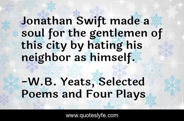 This page presents the quote "Jonathan Swift made a soul for the gentlemen of this city by hating his neighbor as himself.". Author of this quote is W.B. Yeats, Selected Poems and Four Plays. This quote is about neighbors, golden-rule, jonathan-swift, hate, the-tables-of-the-law,.