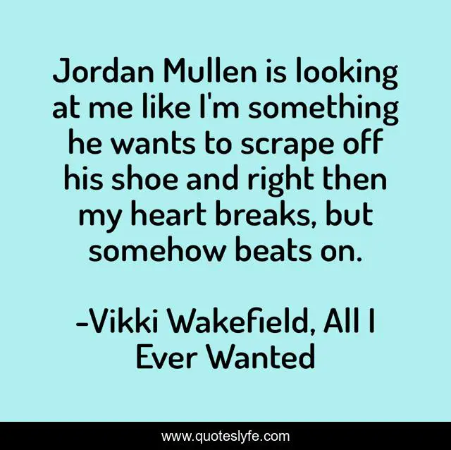 This page presents the quote "Jordan Mullen is looking at me like I'm something he wants to scrape off his shoe and right then my heart breaks, but somehow beats on.". Author of this quote is Vikki Wakefield, All I Ever Wanted. This quote is about heartbreak, love, affection, sad,.