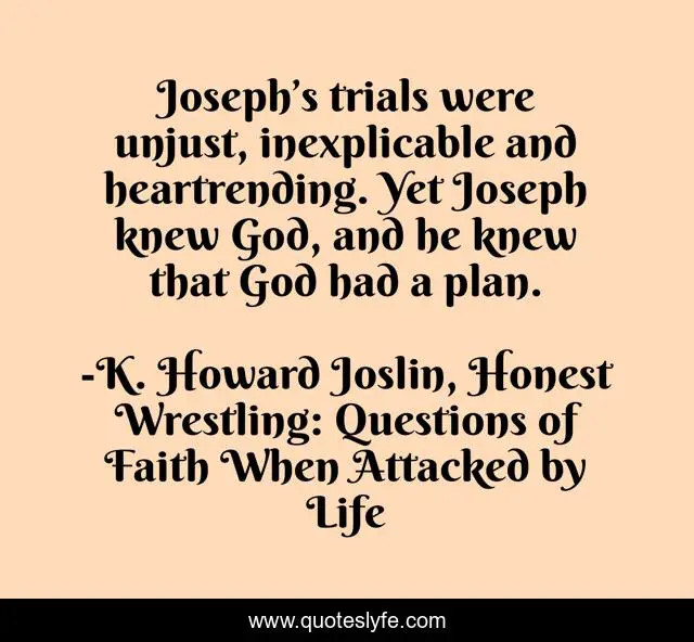 "K. Howard Joslin, Honest Wrestling: Questions of Faith When Attacked by Life Quotes." Quoteslyfe.com, 2025. Fri. 05 Dec. 2025. <https://www.quoteslyfe.com/quote/Joseph-s-trials-were-unjust-inexplicable-and-254132>.