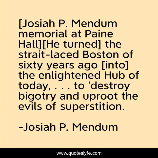 This page presents the quote "[Josiah P. Mendum memorial at Paine Hall][He turned] the strait-laced Boston of sixty years ago [into] the enlightened Hub of today, . . . to 'destroy bigotry and uproot the evils of superstition.". Author of this quote is Josiah P. Mendum. This quote is about paine-hall, memorial, boston, bigotry, superstition, atheism, praise, enlightenment,.