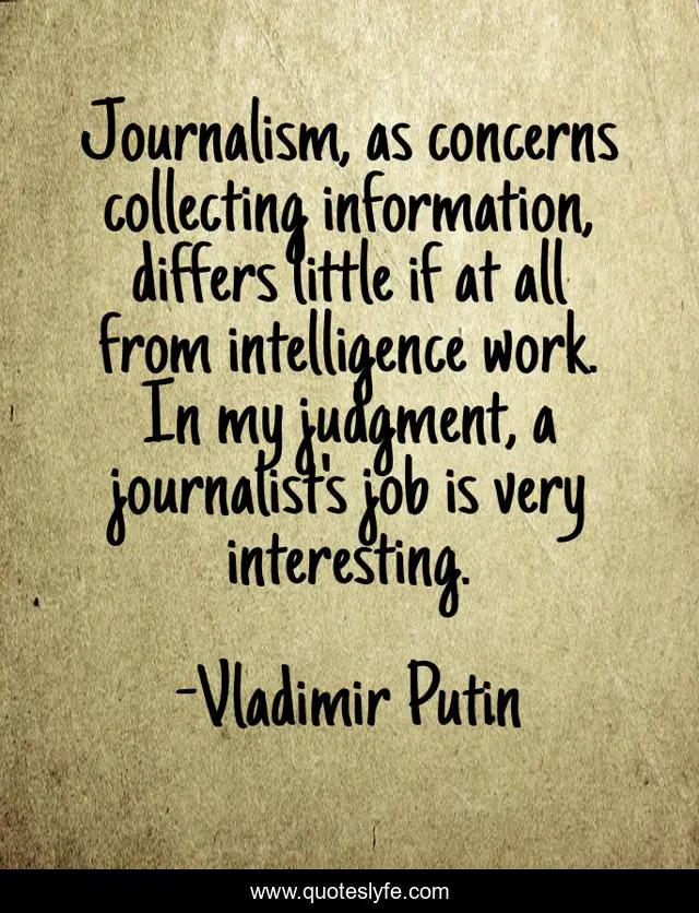 This page presents the quote "Journalism, as concerns collecting information, differs little if at all from intelligence work. In my judgment, a journalist's job is very interesting.". Author of this quote is Vladimir Putin. This quote is about job, work, journalism,.