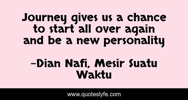 This page presents the quote "Journey gives us a chance to start all over again and be a new personality". Author of this quote is Dian Nafi, Mesir Suatu Waktu. This quote is about chance, journey, mesir, personality,.