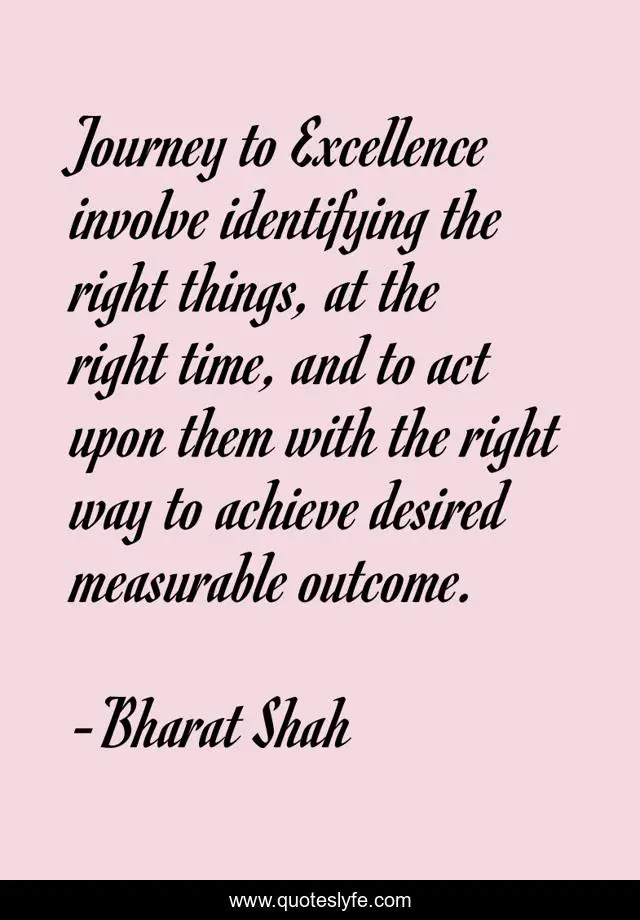 This page presents the quote "Journey to Excellence involve identifying the right things, at the right time, and to act upon them with the right way to achieve desired measurable outcome.". Author of this quote is Bharat Shah. .