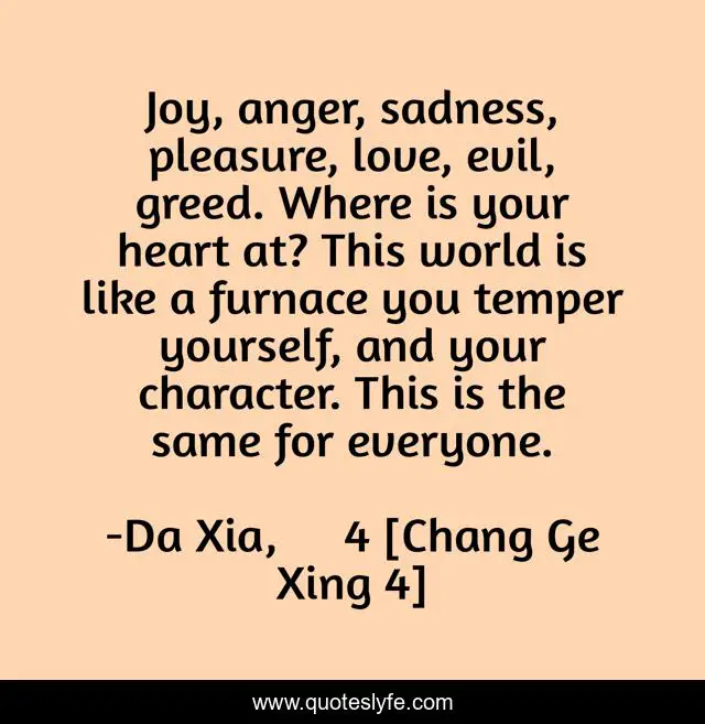 This page presents the quote "Joy, anger, sadness, pleasure, love, evil, greed. Where is your heart at? This world is like a furnace you temper yourself, and your character. This is the same for everyone.". Author of this quote is Da Xia, 長歌行 4 [Chang Ge Xing 4]. This quote is about life, human, life-lessons,.