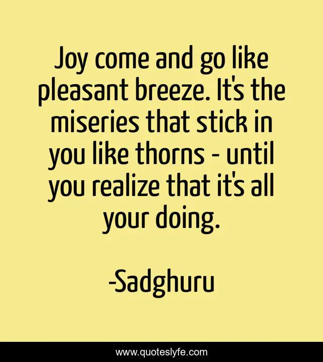 This page presents the quote "Joy come and go like pleasant breeze. It's the miseries that stick in you like thorns - until you realize that it's all your doing.". Author of this quote is Sadghuru. This quote is about joy, misery, inspirational, enthusiasm,.