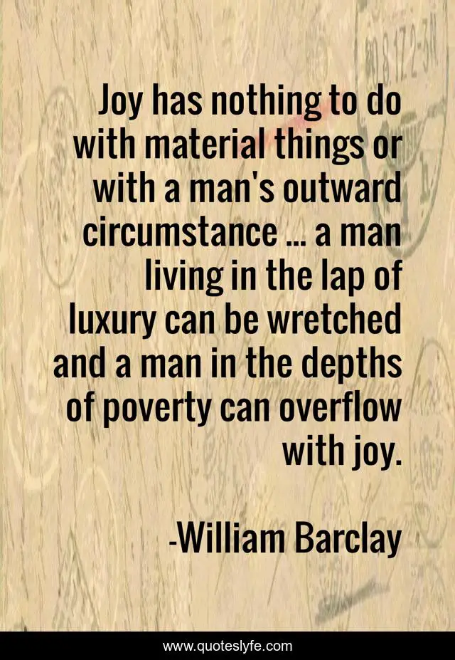 This page presents the quote "Joy has nothing to do with material things or with a man's outward circumstance ... a man living in the lap of luxury can be wretched and a man in the depths of poverty can overflow with joy.". Author of this quote is William Barclay. .