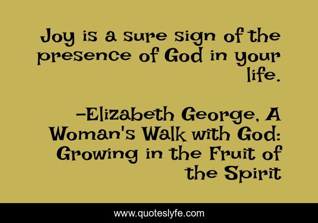 This page presents the quote "Joy is a sure sign of the presence of God in your life.". Author of this quote is Elizabeth George, A Woman's Walk with God: Growing in the Fruit of the Spirit. This quote is about faith, life, woman, christian, presence, joy, sign, god, love,.